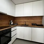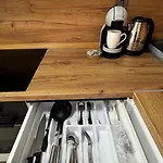 Das Apartment bietet Ausstattung zur Kaffee- & Teezubereitung sowie eine Küche mit einer Mikrowelle, einem Wasserkocher und einem Kühlschrank an.
